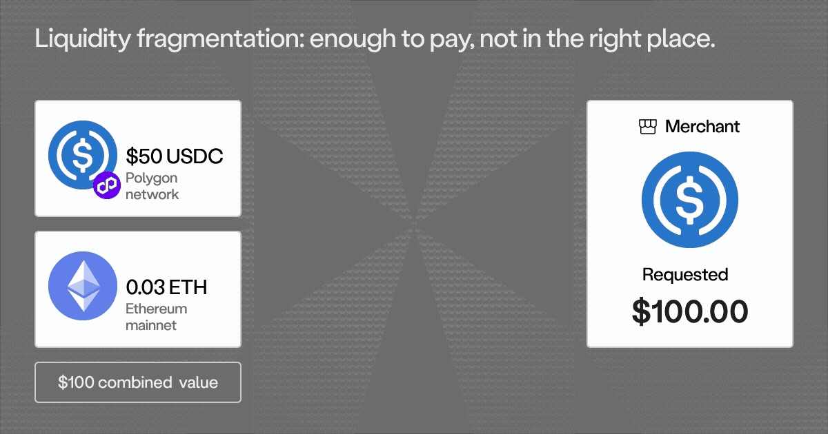 Picture a customer who needs to pay $100. They have $50 in USDC on Polygon and 0.03 ETH on Ethereum. With most crypto payment systems, this transaction fails. The merchant requested USDC on Ethereum. The customer doesn't have $100 of USDC on Ethereum. Transaction declined.